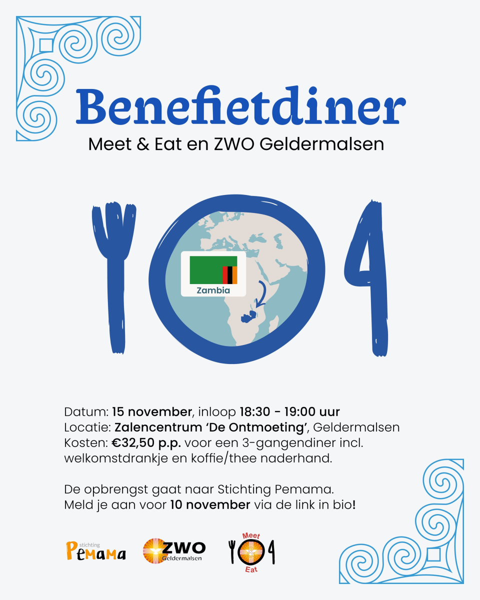 ![]() Op zaterdag 15 november organiseren de Meet&Eat groep en de ZWO-commissie van de Centrumkerk en de Emmakerk een benefietdiner voor St. Pemama. Stichting Pemama ondersteunt St. Pemama’s Primary & Secondary School in Zambia. Wat in 2009 begon met een klein klasje, is inmiddels uitgegroeid tot een school met rond de 120 leerlingen – zowel basisscholieren als middelbare scholieren als volwassenen. Al met al is het een volle bedoening op de school en er is dringend meer ruimte nodig. Het geld wat met het benefietdiner ingezameld wordt, zal gebruikt worden voor de bouw en inrichting van een nieuwe school buiten de stad. Daar zal voldoende ruimte zijn om alle leerlingen goed onderwijs te bieden en is ook ruimte voor tuinbouwactiviteiten om eigen inkomsten te genereren en mensen een vak te leren. Daarmee worden de kansen op een goede toekomst voor de leerlingen vergroot. Het diner vindt plaats op 15 november in Zalencentrum ‘De Ontmoeting’, Geldermalsen. Inloop vanaf 18:30 uur, aanvang diner: 19:00 uur. De kosten bedragen €32,50 p.p. voor een 3-gangendiner incl. welkomstdrankje en koffie/thee naderhand. Aanmelden? Klik hier! De recepten zijn al uitgeprobeerd en het belooft een heerlijke maaltijd én een gezellige avond te worden! Van harte welkom! |